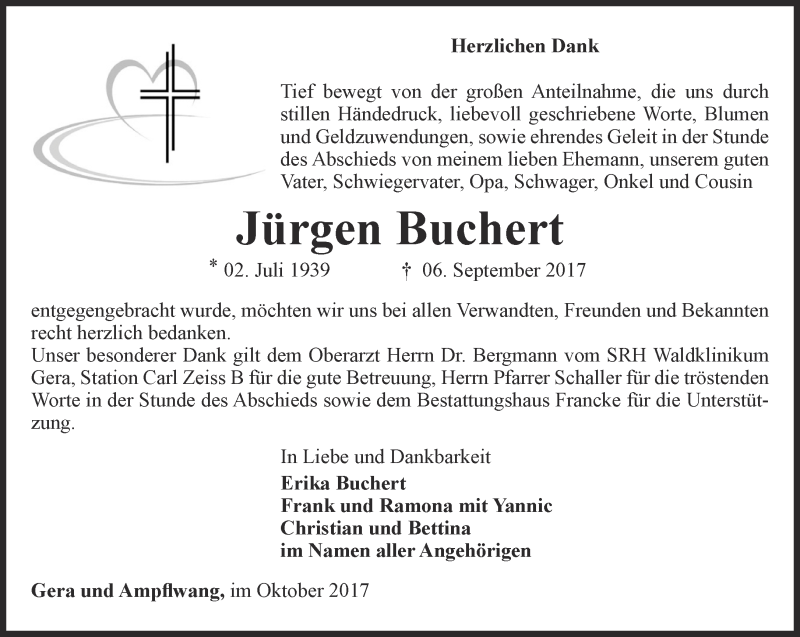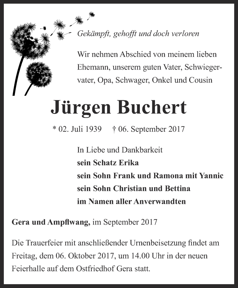 Hier finden Sie alle Traueranzeigen aus der Zeitung, die bisher für Jürgen Buchert erschienen sind. Weitere Traueranzeigen, die in der Zeitung erscheinen, werden hier ebenfalls aufgelistet