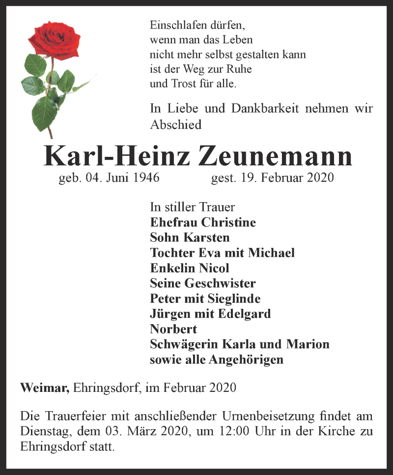 Hier finden Sie alle Traueranzeigen aus der Zeitung, die bisher für Karl-Heinz Zeunemann erschienen sind. Weitere Traueranzeigen, die in der Zeitung erscheinen, werden hier ebenfalls aufgelistet