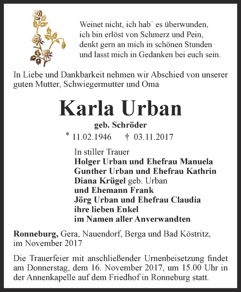 Hier finden Sie alle Traueranzeigen aus der Zeitung, die bisher für Karla Urban erschienen sind. Weitere Traueranzeigen, die in der Zeitung erscheinen, werden hier ebenfalls aufgelistet