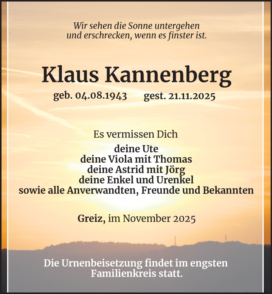 Hier finden Sie alle Traueranzeigen aus der Zeitung, die bisher für Klaus Kannenberg erschienen sind. Weitere Traueranzeigen, die in der Zeitung erscheinen, werden hier ebenfalls aufgelistet