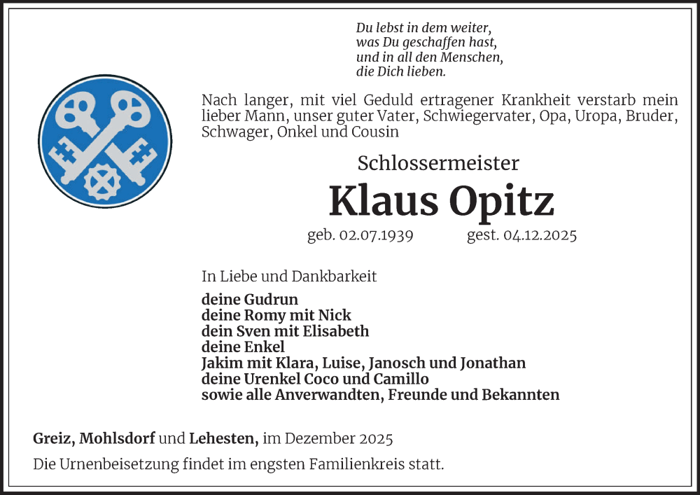 Hier finden Sie alle Traueranzeigen aus der Zeitung, die bisher für Klaus Opitz erschienen sind. Weitere Traueranzeigen, die in der Zeitung erscheinen, werden hier ebenfalls aufgelistet
