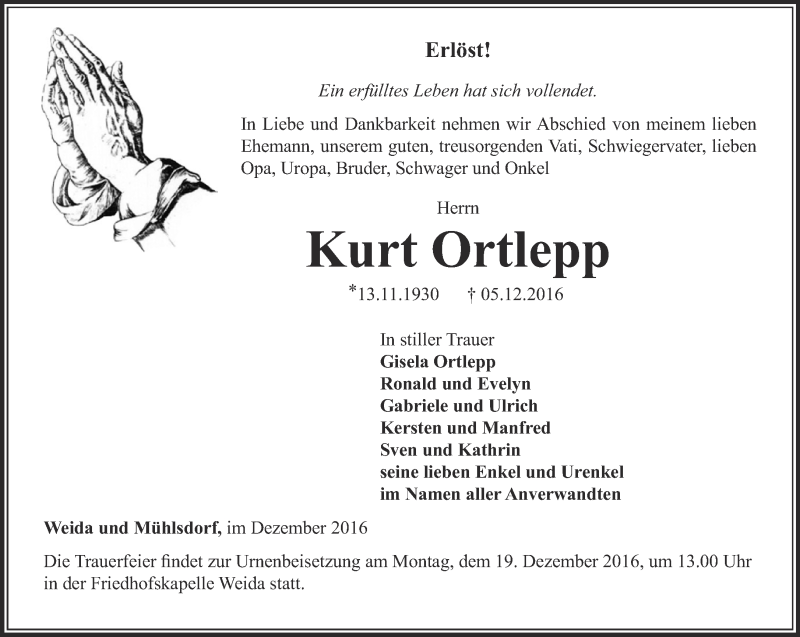 Hier finden Sie alle Traueranzeigen aus der Zeitung, die bisher für Kurt Ortlepp erschienen sind. Weitere Traueranzeigen, die in der Zeitung erscheinen, werden hier ebenfalls aufgelistet