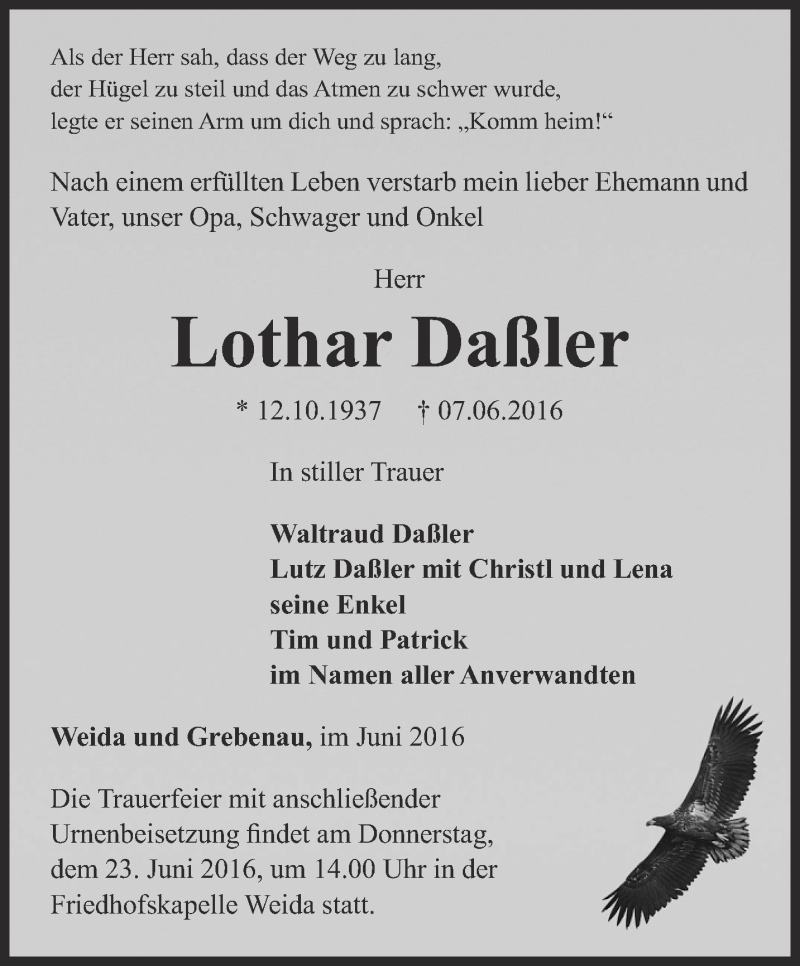 Hier finden Sie alle Traueranzeigen aus der Zeitung, die bisher für Lothar Daßler erschienen sind. Weitere Traueranzeigen, die in der Zeitung erscheinen, werden hier ebenfalls aufgelistet
