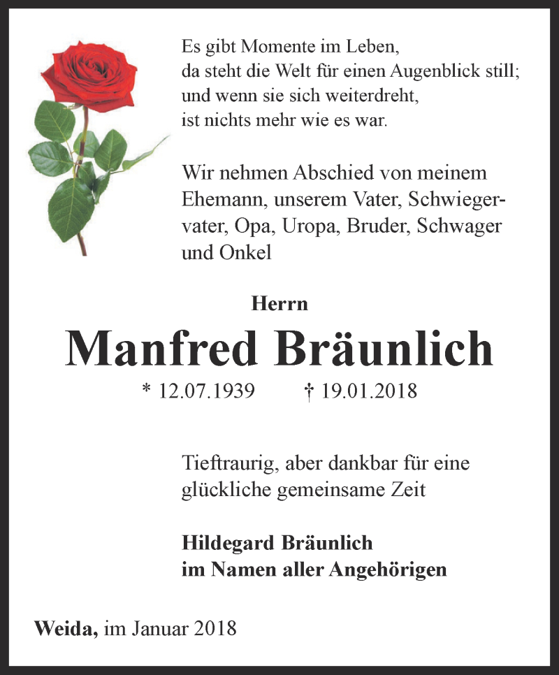 Hier finden Sie alle Traueranzeigen aus der Zeitung, die bisher für Manfred Bräunlich erschienen sind. Weitere Traueranzeigen, die in der Zeitung erscheinen, werden hier ebenfalls aufgelistet