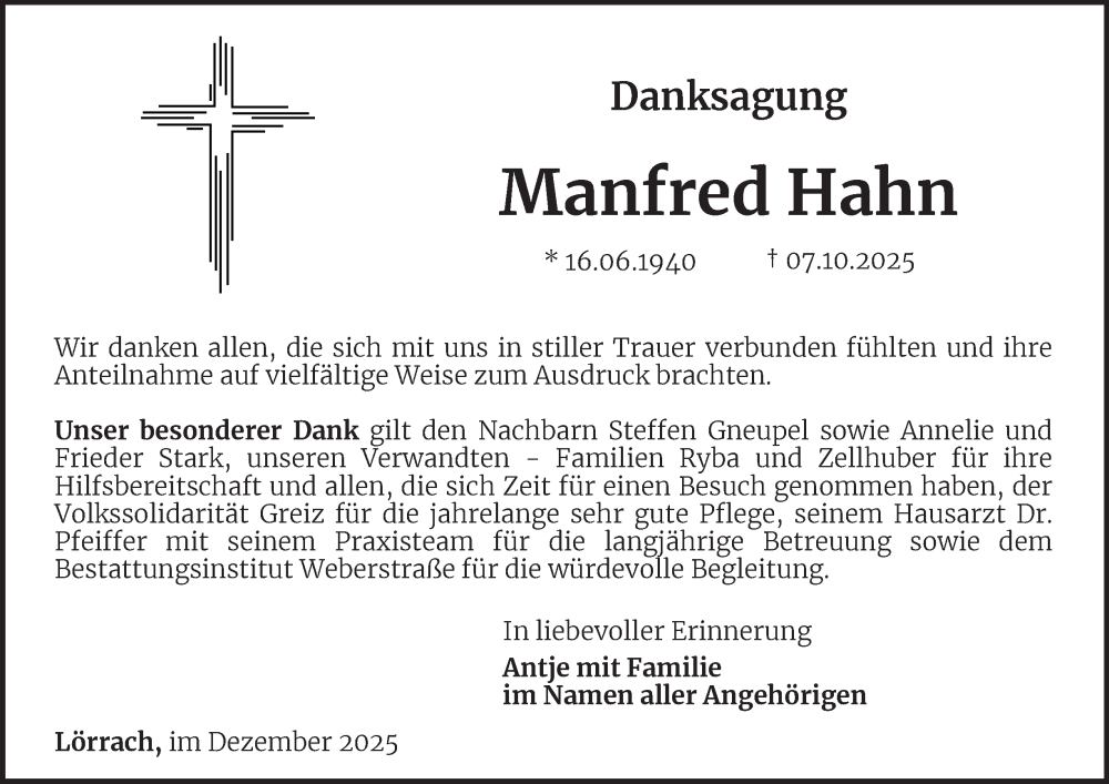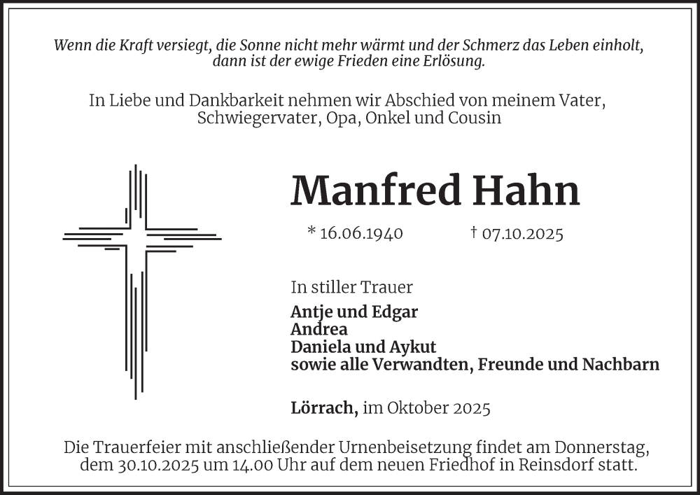 Hier finden Sie alle Traueranzeigen aus der Zeitung, die bisher für Manfred Hahn erschienen sind. Weitere Traueranzeigen, die in der Zeitung erscheinen, werden hier ebenfalls aufgelistet