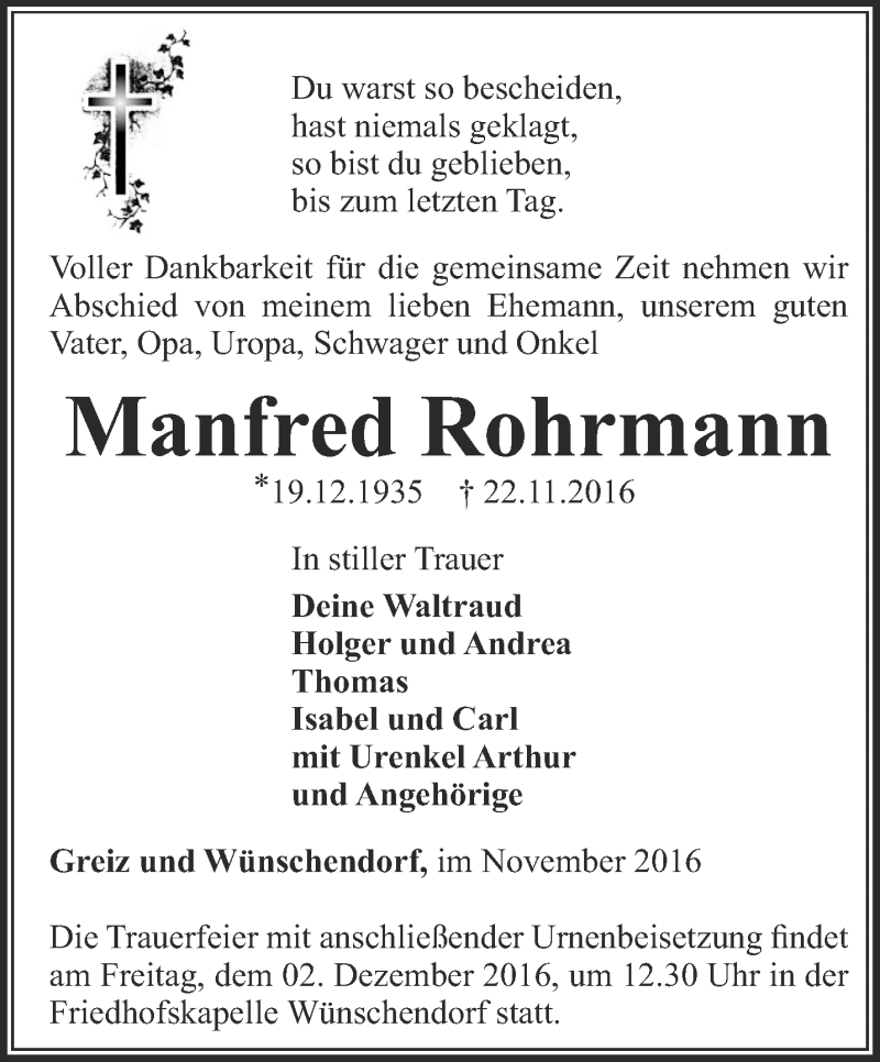 Hier finden Sie alle Traueranzeigen aus der Zeitung, die bisher für Manfred Rohrmann erschienen sind. Weitere Traueranzeigen, die in der Zeitung erscheinen, werden hier ebenfalls aufgelistet