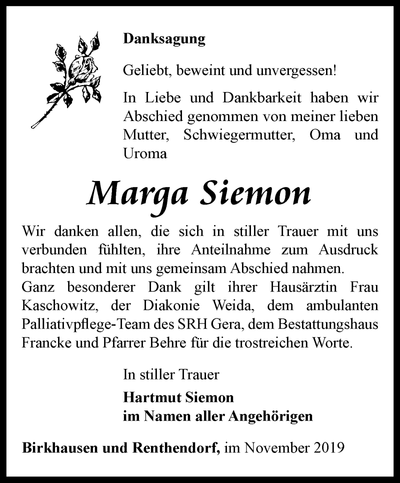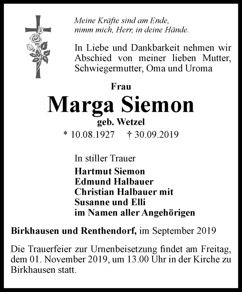 Hier finden Sie alle Traueranzeigen aus der Zeitung, die bisher für Marga Siemon erschienen sind. Weitere Traueranzeigen, die in der Zeitung erscheinen, werden hier ebenfalls aufgelistet