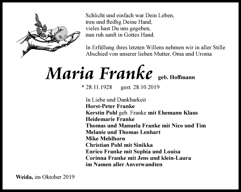 Hier finden Sie alle Traueranzeigen aus der Zeitung, die bisher für Maria Franke erschienen sind. Weitere Traueranzeigen, die in der Zeitung erscheinen, werden hier ebenfalls aufgelistet