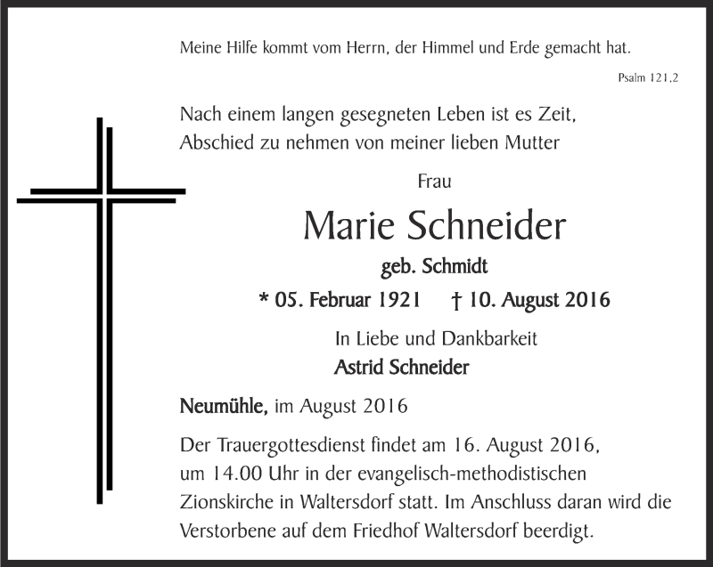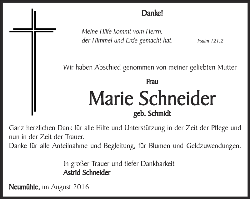 Hier finden Sie alle Traueranzeigen aus der Zeitung, die bisher für Marie Schneider erschienen sind. Weitere Traueranzeigen, die in der Zeitung erscheinen, werden hier ebenfalls aufgelistet