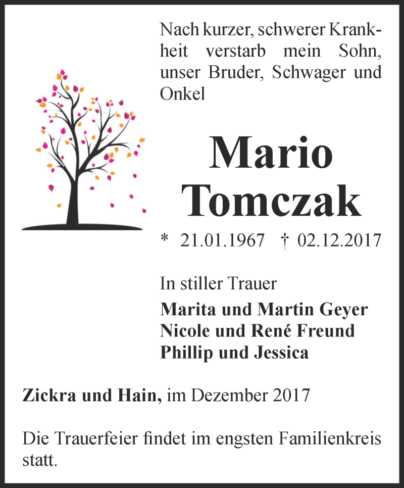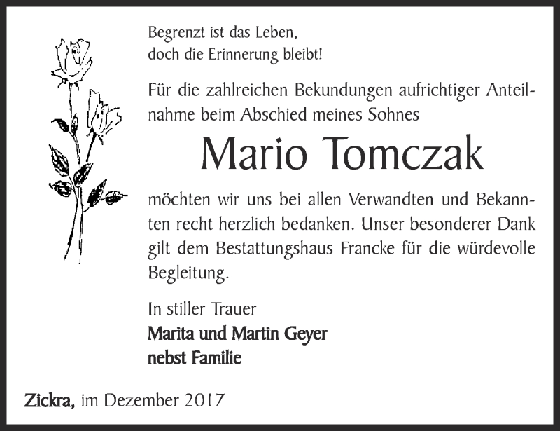 Hier finden Sie alle Traueranzeigen aus der Zeitung, die bisher für Mario Tomczak erschienen sind. Weitere Traueranzeigen, die in der Zeitung erscheinen, werden hier ebenfalls aufgelistet
