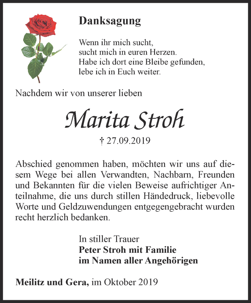 Hier finden Sie alle Traueranzeigen aus der Zeitung, die bisher für Marita Stroh erschienen sind. Weitere Traueranzeigen, die in der Zeitung erscheinen, werden hier ebenfalls aufgelistet