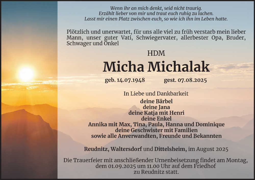 Hier finden Sie alle Traueranzeigen aus der Zeitung, die bisher für Micha Michalak erschienen sind. Weitere Traueranzeigen, die in der Zeitung erscheinen, werden hier ebenfalls aufgelistet