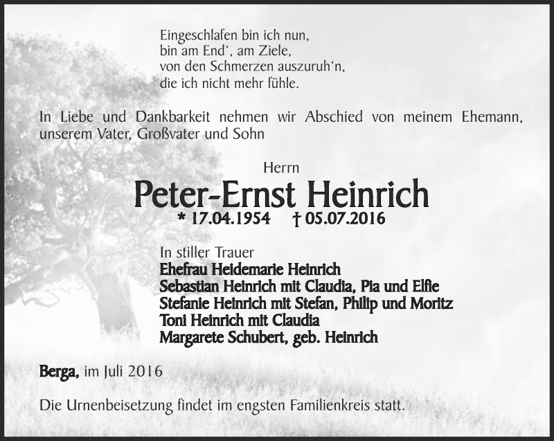 Hier finden Sie alle Traueranzeigen aus der Zeitung, die bisher für Peter-Ernst Heinrich erschienen sind. Weitere Traueranzeigen, die in der Zeitung erscheinen, werden hier ebenfalls aufgelistet