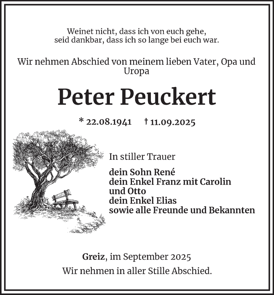 Hier finden Sie alle Traueranzeigen aus der Zeitung, die bisher für Peter Peuckert erschienen sind. Weitere Traueranzeigen, die in der Zeitung erscheinen, werden hier ebenfalls aufgelistet