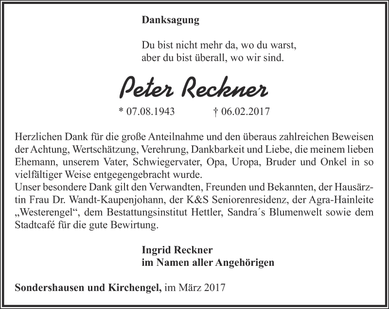 Hier finden Sie alle Traueranzeigen aus der Zeitung, die bisher für Peter Reckner erschienen sind. Weitere Traueranzeigen, die in der Zeitung erscheinen, werden hier ebenfalls aufgelistet