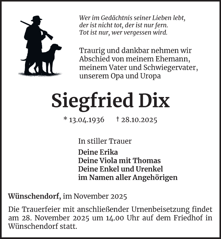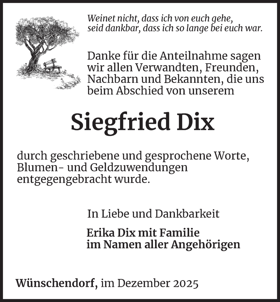 Hier finden Sie alle Traueranzeigen aus der Zeitung, die bisher für Siegfried Dix erschienen sind. Weitere Traueranzeigen, die in der Zeitung erscheinen, werden hier ebenfalls aufgelistet