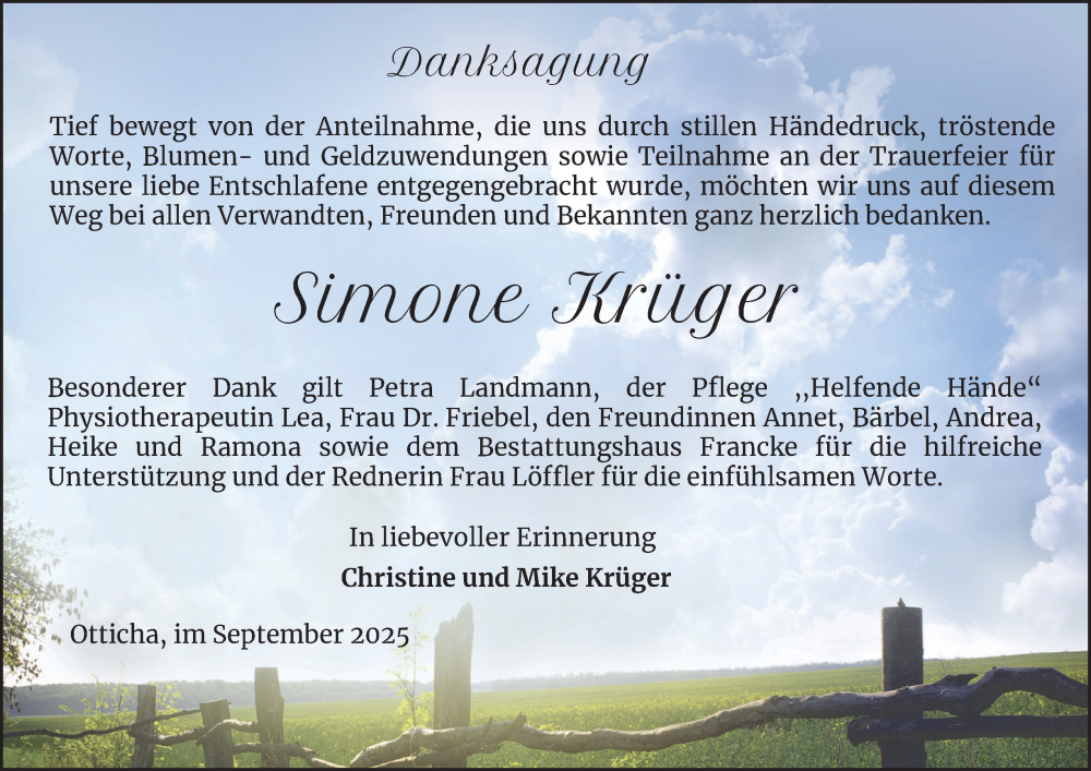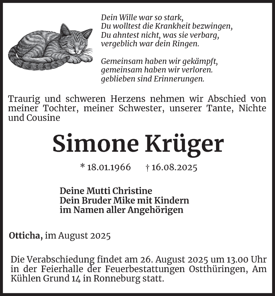 Hier finden Sie alle Traueranzeigen aus der Zeitung, die bisher für Simone Krüger erschienen sind. Weitere Traueranzeigen, die in der Zeitung erscheinen, werden hier ebenfalls aufgelistet