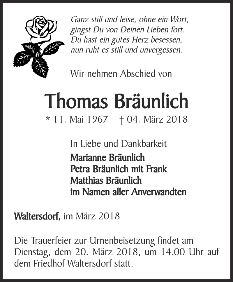 Hier finden Sie alle Traueranzeigen aus der Zeitung, die bisher für Thomas Bräunlich erschienen sind. Weitere Traueranzeigen, die in der Zeitung erscheinen, werden hier ebenfalls aufgelistet