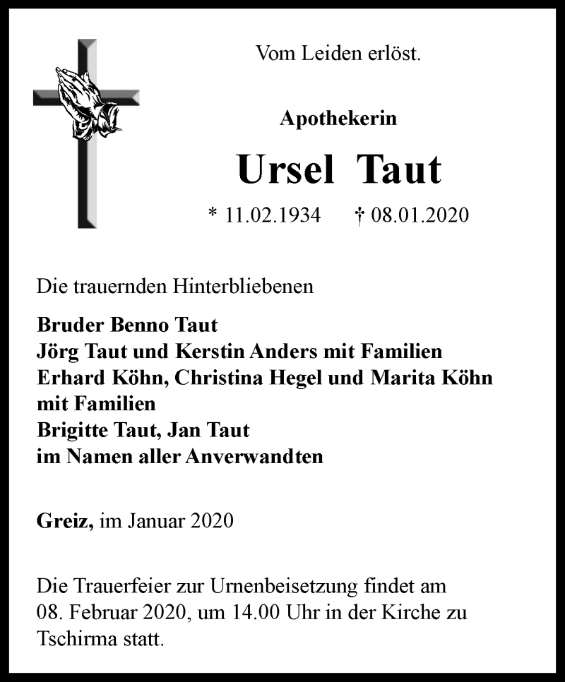Hier finden Sie alle Traueranzeigen aus der Zeitung, die bisher für Ursel Taut erschienen sind. Weitere Traueranzeigen, die in der Zeitung erscheinen, werden hier ebenfalls aufgelistet