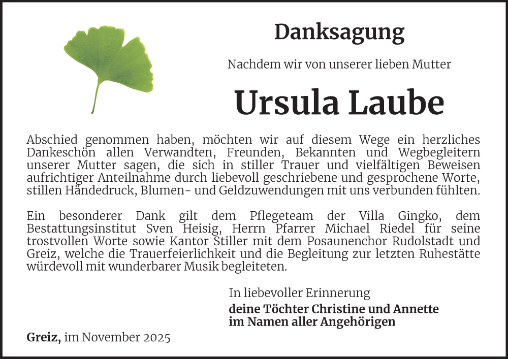 Hier finden Sie alle Traueranzeigen aus der Zeitung, die bisher für Ursula Laube erschienen sind. Weitere Traueranzeigen, die in der Zeitung erscheinen, werden hier ebenfalls aufgelistet