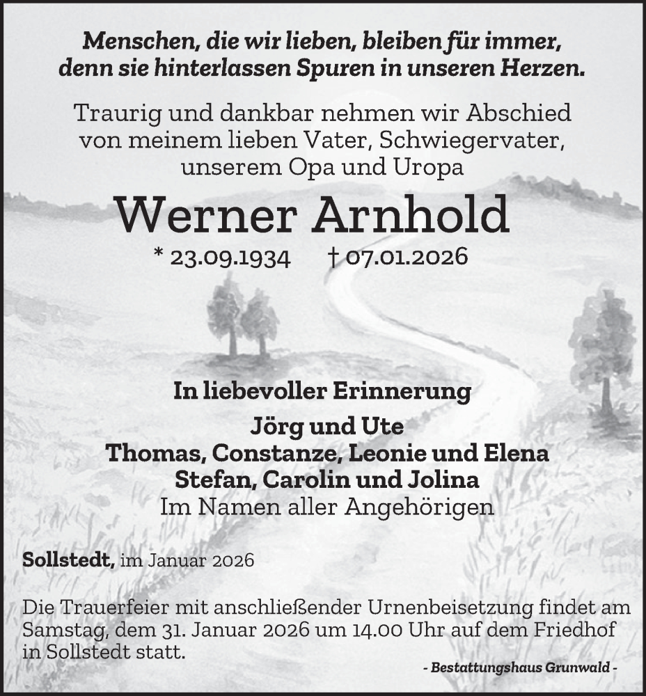 Hier finden Sie alle Traueranzeigen aus der Zeitung, die bisher für Werner Arnhold erschienen sind. Weitere Traueranzeigen, die in der Zeitung erscheinen, werden hier ebenfalls aufgelistet