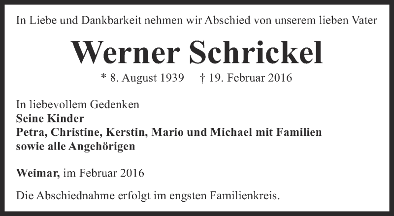 Hier finden Sie alle Traueranzeigen aus der Zeitung, die bisher für Werner Schrickel erschienen sind. Weitere Traueranzeigen, die in der Zeitung erscheinen, werden hier ebenfalls aufgelistet