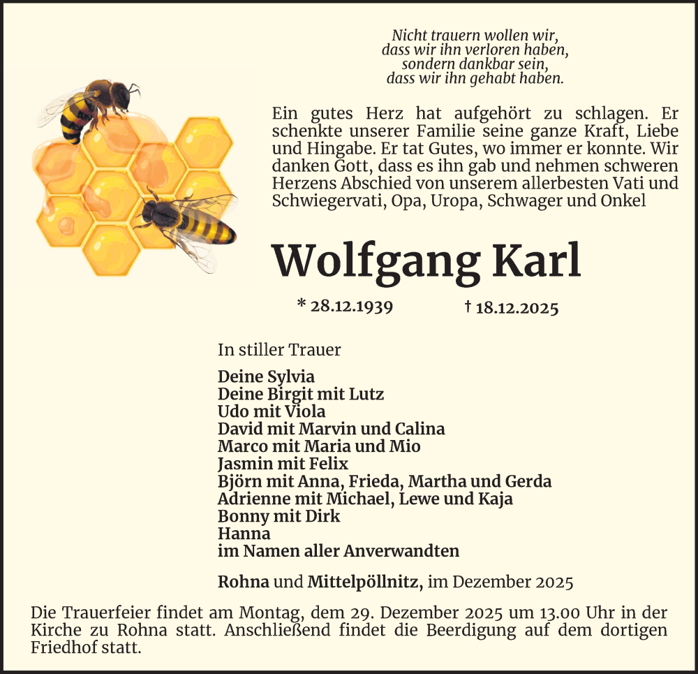 Hier finden Sie alle Traueranzeigen aus der Zeitung, die bisher für Wolfgang Karl erschienen sind. Weitere Traueranzeigen, die in der Zeitung erscheinen, werden hier ebenfalls aufgelistet