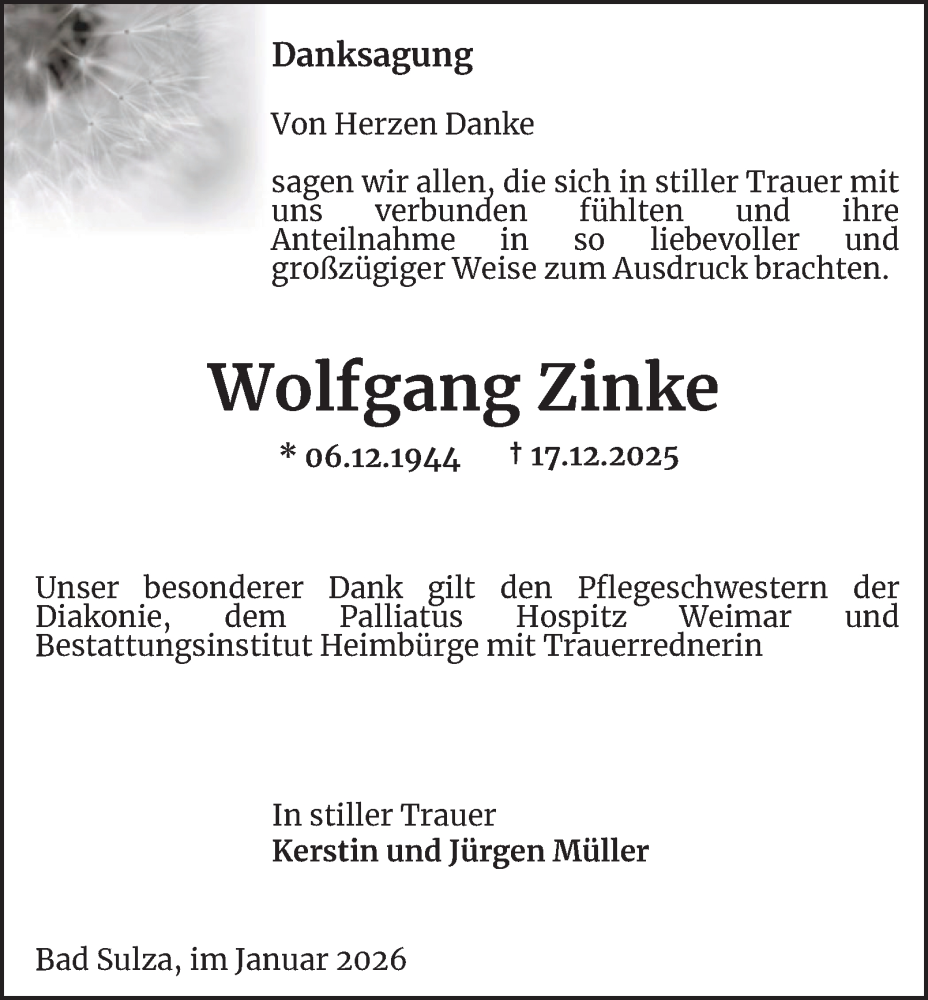 Hier finden Sie alle Traueranzeigen aus der Zeitung, die bisher für Wolfgang Zinke erschienen sind. Weitere Traueranzeigen, die in der Zeitung erscheinen, werden hier ebenfalls aufgelistet