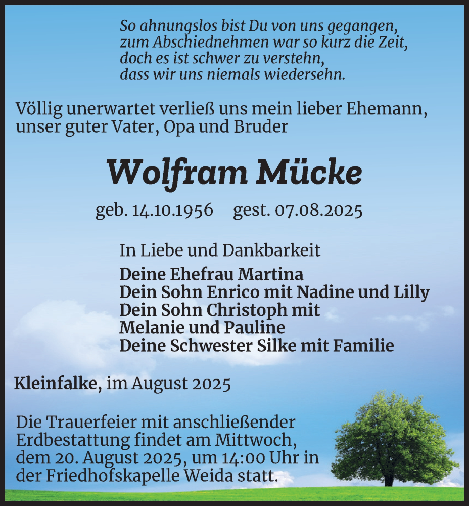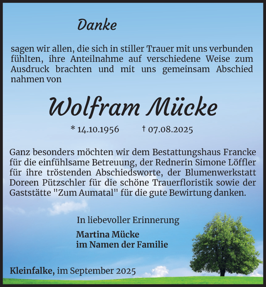 Hier finden Sie alle Traueranzeigen aus der Zeitung, die bisher für Wolfram Mücke erschienen sind. Weitere Traueranzeigen, die in der Zeitung erscheinen, werden hier ebenfalls aufgelistet